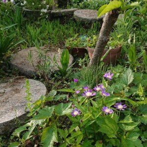 25年目の庭です。温暖化の影響で暑さに強い草花に少しずつ変えています。